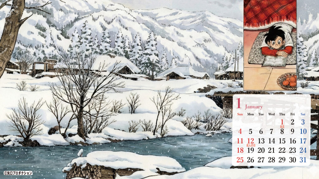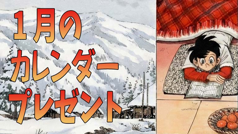 2026年の1月のカレンダーは『釣りキチ三平』の「忙中に閑あり」、私が個人的にとても好きな作品です。滑り台付きかまくらとか作ってみたく思いましたねー。