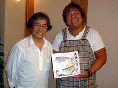 楽しい食事も終り、恒例の直筆サイン入り 色紙を石塚氏に贈った矢口。 これからもお互いに健康管理をしながら サウナで汗をかきましょう。 |